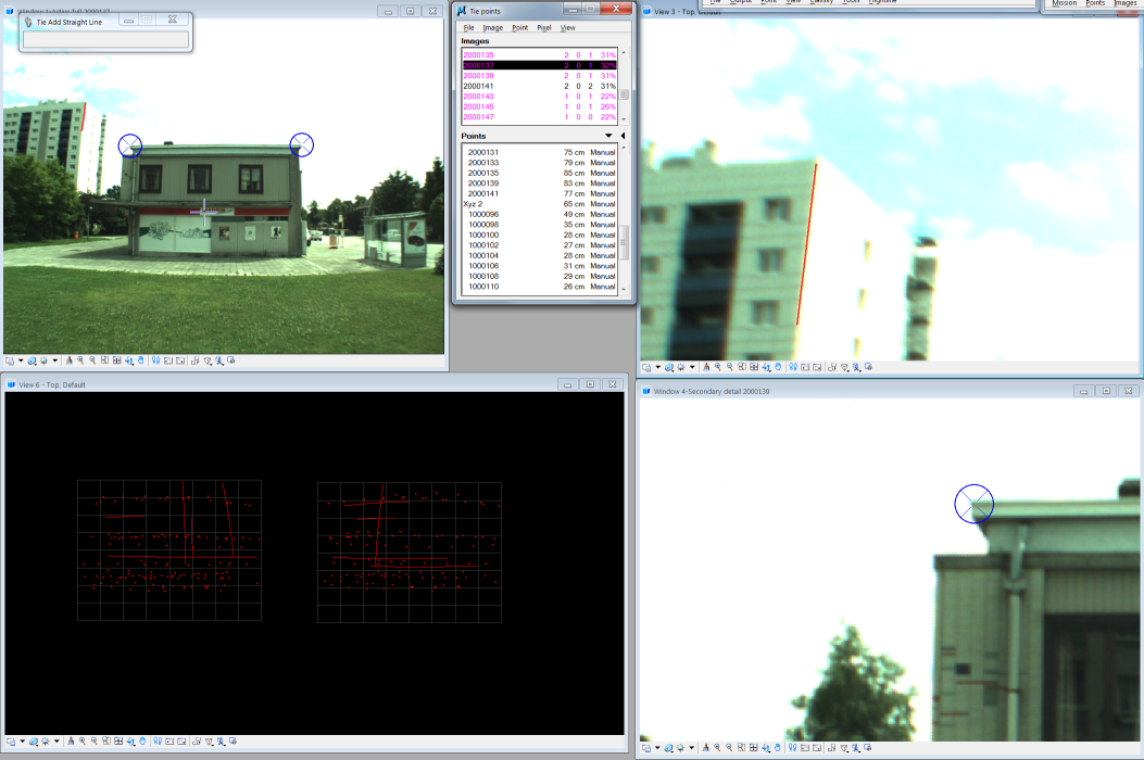 If accurately oriented aerial images are available, those can be used to position roof edges more accurately. The application automatically creates a perspective view in which the vector model can be viewed as seen from the focal point of an aerial image. As the plane equations are known from laser data, the edge positions can be measured from a single image.